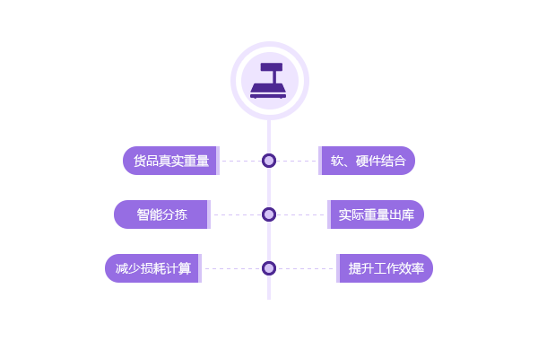 分拣系统与电子秤无缝连接,系统直接抓取货品真实重,软、硬件结合,智能分拣;流水作业、分拣完提醒,按实际斤两出库,减少损耗计算;提升工作效率